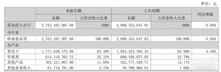 从产品来看,今年上半年,公司两大产品系列均呈下降态势,其中核心产品葵花子收入为17.72,占总营收的64.39%,仍为公司营收主力,但相较于去年同期,微降4.45%,坚果类产品收入为6.14亿元,同比下降6.98%,营收占比为22.32%。