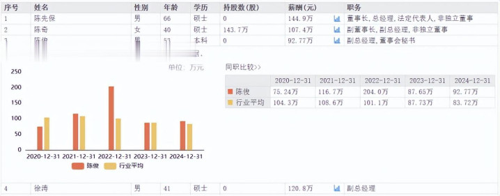 而在去年公司业绩上涨的背景下,公司高管薪酬纷纷增长。陈俊2024年薪酬为92.77万元,相较于2023年的87.65万元,上涨了5.12万元,是三位副总经理中涨薪最多的,但仍低于另外两位副总陈奇、徐涛。陈奇薪酬由2023年的105.5万元上调至107.4万元,徐涛则由2023年的133.5万元下调至120.8万元。